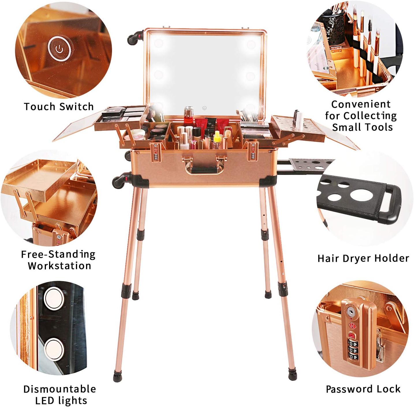 - 【FREE-STANDING WORKSTATION】- Sturdy telescoping legs can be installed and adjusted to ke the case 4 adjustable height with 18.7″(47.5cm)/29.7″(75.5cm)/31.5″(80cm)/33.3″(84.5cm) off the floor, great for salon use, shopping mall display, home and freelance makeup artists and dance competition need; Legs’ bottom bowl-shaped feet also adjustable to fit uneven floor; Telescoping handle and 4 detachable wheels with 360° movement for easy transportation.