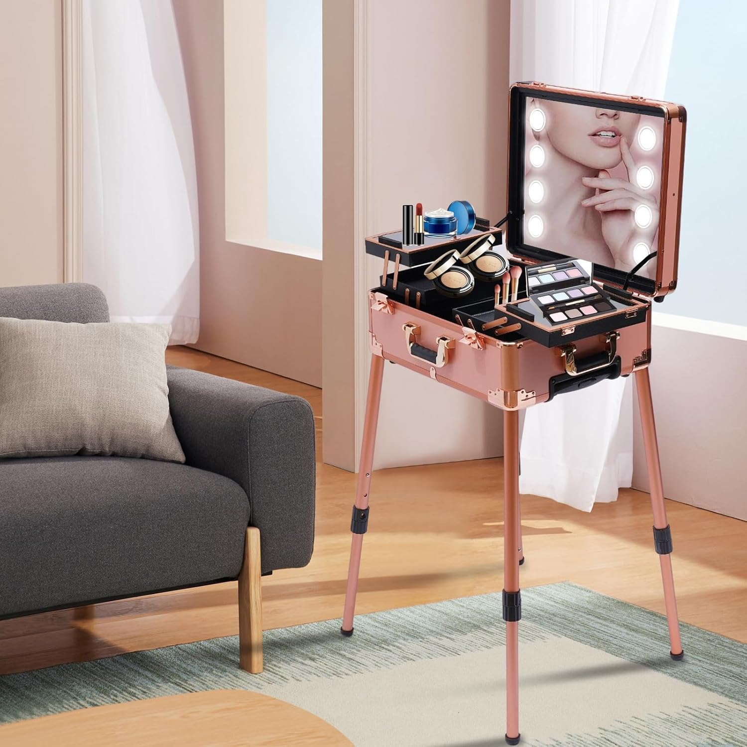 - STANDING WORKSTATION: Sturdy telescoping legs can be installed and adjusted to ke the case 3 adjustable height (up to 82cm/32.3inch), great for salon use, shopping mall display, home and freelance makeup artists and dance competition need; Legs’ bottom bowl-shaped feet also adjustable to fit uneven floor; Telescoping handle and 4 detachable wheels with 360° movement for easy transportation