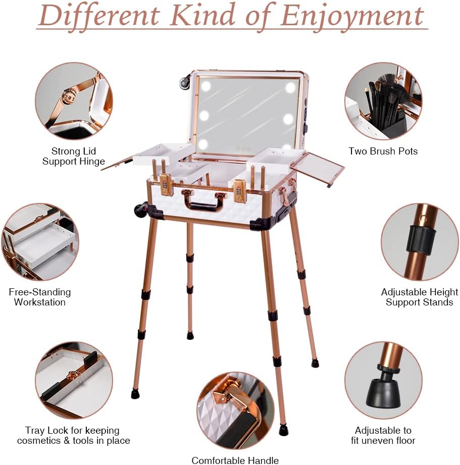 - 【COMPARTMENT LAYOUT】- Open the case to reveal 4 storage trays(removable) and other 3 compartments that accommodate all your beauty supplies neatly organized.【PREMIUM QUALITY & LOOK】- sturdy aluminum frame, reinforced corner, exterior and PU interior make this makeup case last for years; widely used in fashion runway as temporary makeup station and beauty travel luggage.