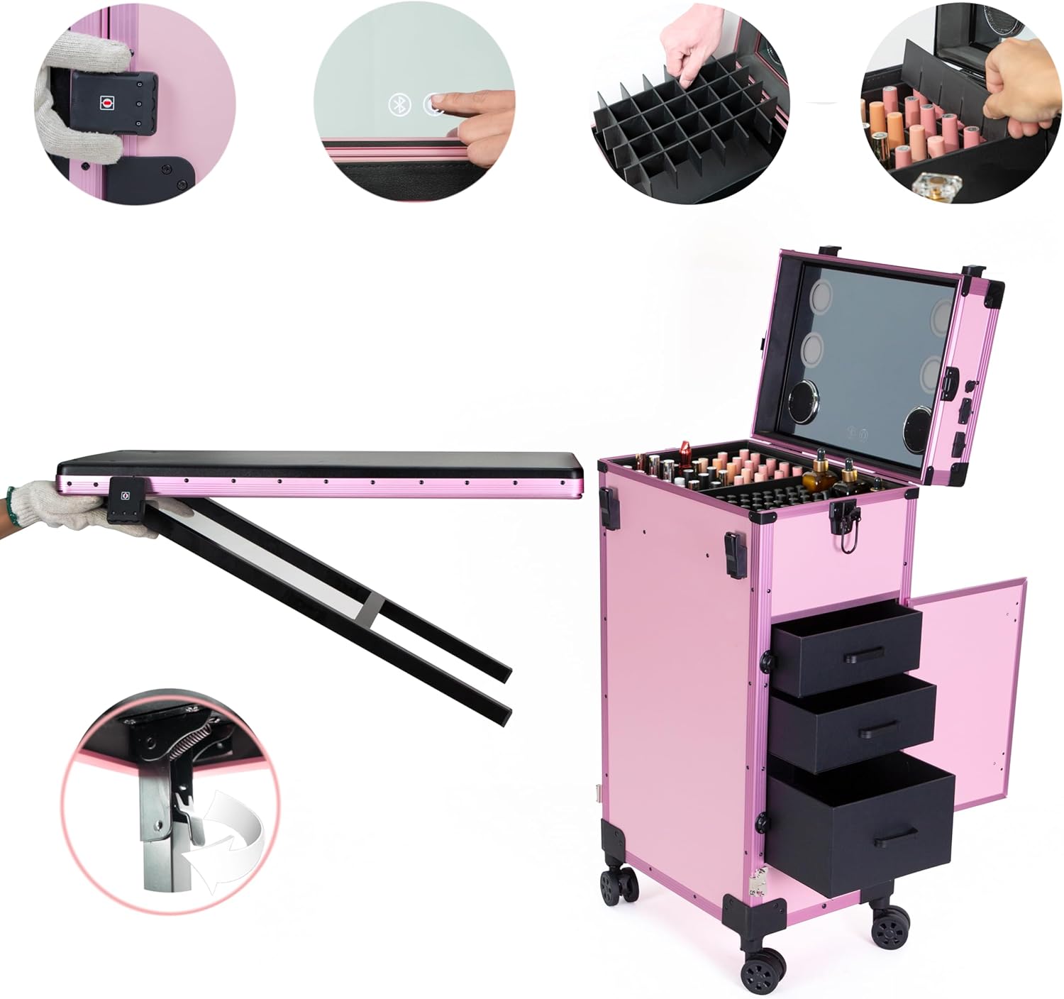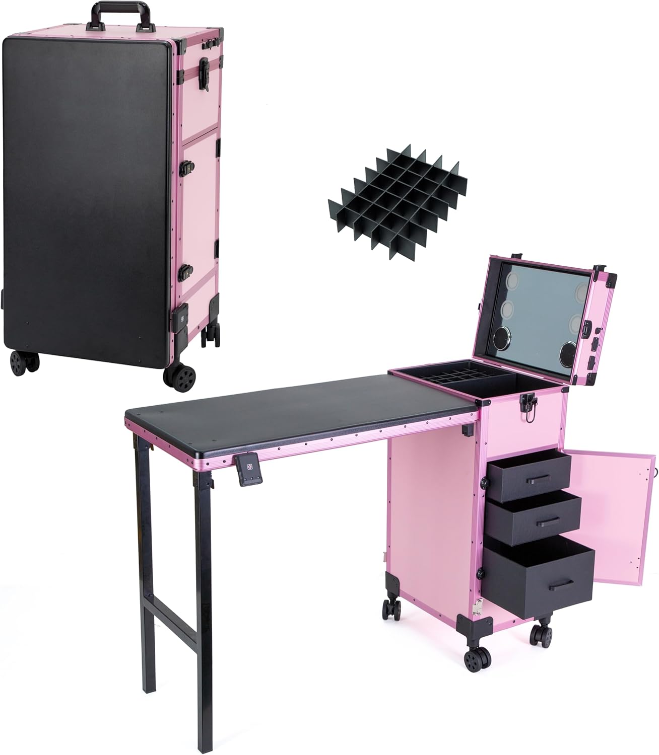 - Perfect Mobile Work Platform: The size of this makeup rolling case is 15.3 x 10.8 x 30.8 inches with a foldable 27.8×15.3 inches desk. With its anti-shake design and solid metal frame, it ensures stability. Perfect for nail artists, makeup artists, temporary make-up rooms, or accessory stalls in flea markets.